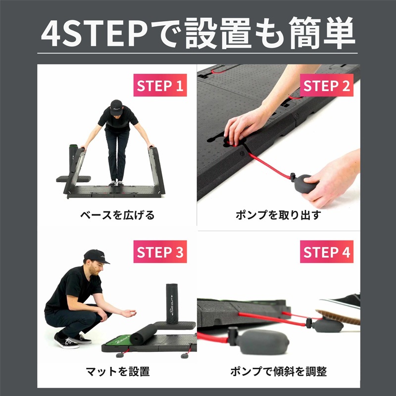 折りたたんでコンパクトに収納できる設計ながら、本番に近い傾斜がある練習を可能にします。