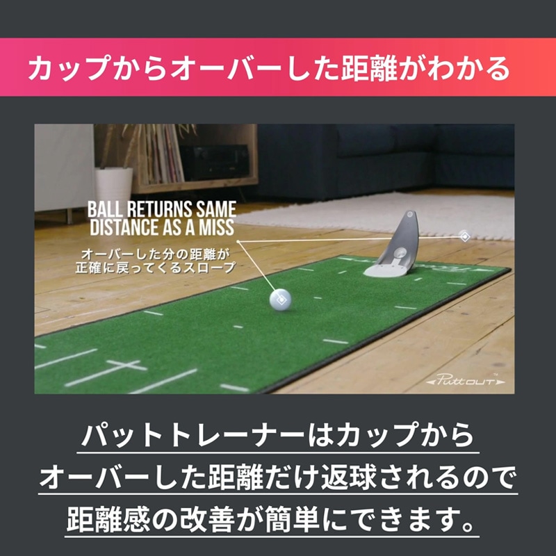 コース上のショットの40%を占めるパッティング。 しかし、多くのゴルファーは「パッティングの練習が面白くない」という理由からパッティングの練習をほとんどしない人が多いです。 しかし、スコアアップをするにはパター、その中でも1.5~2mのショートパットを高確率で沈める必要があります。 そこで我々PuttOUTは「ショートパットをもっと練習する機会を与え、パッティングに夢中になれる練習器具を作りたい。」と考えました。 その思いから、これまでにない革新的な練習器具をいくつも開発し、多くのゴルファー様に自宅でもハイレベルで楽しいパッティング練習を提供してきました。 ぜひ自宅でのパター練習としてご活用してみてください。