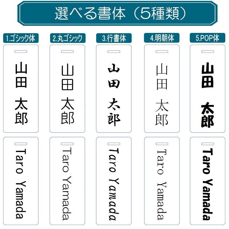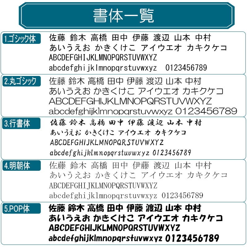ゴシック体、丸ゴシック、行書体、明朝体、POP体 5種類の中からお選びください。